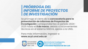 Informamos que, debido a inconvenientes técnicos en el sistema SIGEVA, ajenos a la Universidad Nacional de San Luis (UNSL), se ha dispuesto una prórroga en…