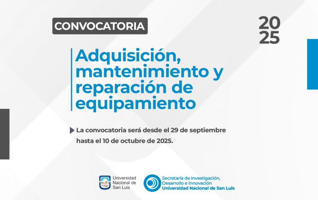 La Secretaría de Investigación, Desarrollo e Innovación de la Universidad Nacional de San Luis, en el marco de lo establecido por la OCS 9/2024, abre la convocatoria destinada a la adquisición, mantenimiento y reparación de equipamiento científico y tecnológico (Res_212-25).