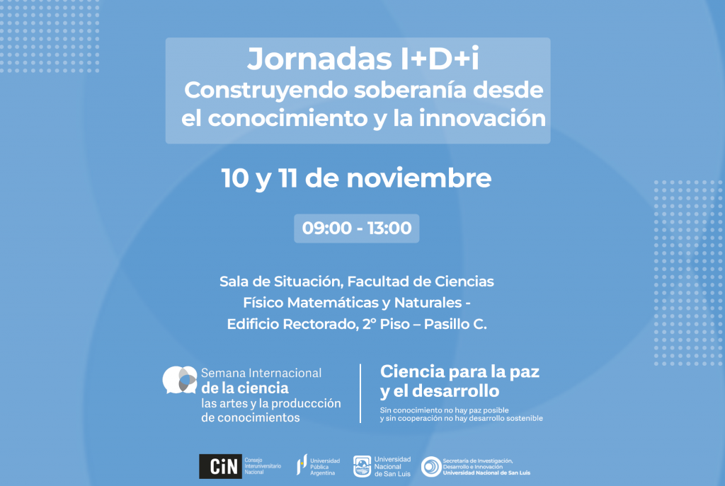 Las Jornadas I+D+i “construyendo soberanía desde el conocimiento y la innovación” organizadas por la Secretaría de Investigación, Desarrollo e Innovación de la Universidad Nacional de San Luis, junto con la Sub-secretaría de Vinculación Territorial y las Secretarías de Investigación de las Unidades Académicas, surgen en el marco de la Semana Internacional de la Ciencia para la Paz y el Desarrollo, organizada por el Consejo Interuniversitario Nacional, con el objetivo de reafirmar el rol esencial del conocimiento como motor para construir un mundo más justo, sostenible y solidario.